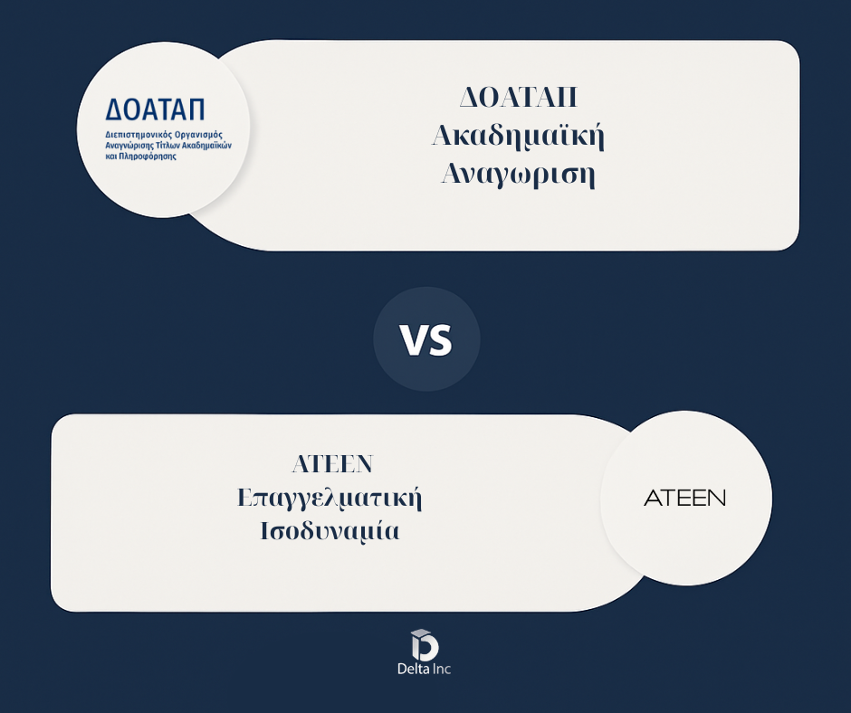 Η αναγνώριση τίτλων σπουδών στην Ελλάδα ΔΟΑΤΑΠ ΑΤΕΕΝ είναι κρίσιμη για όσους ολοκληρώνουν σπουδές στο εξωτερικό ή μέσω κολεγίων. Ο ΔΟΑΤΑΠ προσφέρει ακαδημαϊκή ισοδυναμία, ενώ το ΑΤΕΕΝ αναγνωρίζει επαγγελματικά δικαιώματα. Στον οδηγό αυτό θα βρείτε όλα τα βήματα, τις διαφορές και τις προϋποθέσεις: